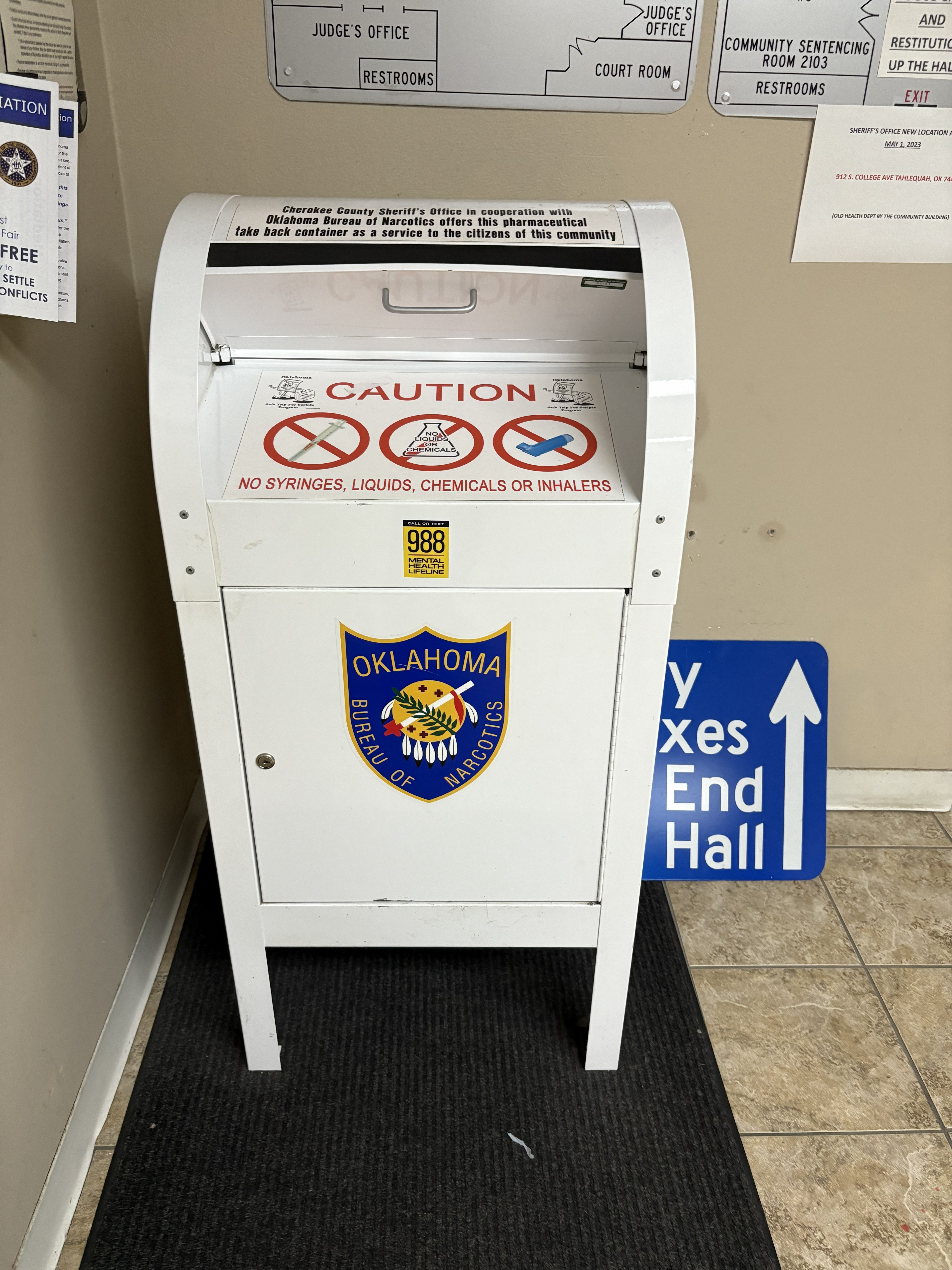 The Cherokee County Sheriff’s Office, in cooperation with the Oklahoma Bureau of Narcotics, provides a secure pharmaceutical take-back drop box for proper disposal of unused or expired medications. This service is offered year-round during regular courthouse hours as a free resource to the citizens of Cherokee County.